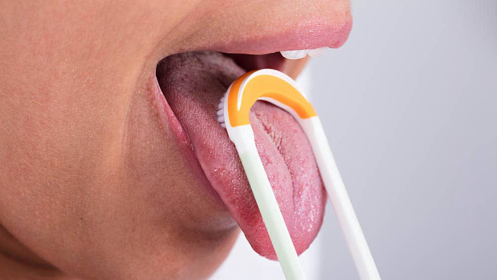 • Higienizar a língua com a escova dental ou com raspadores de língua (próprios para a higiene no local);